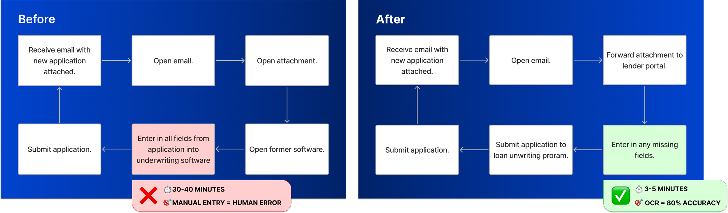 Application time dropped from 10+ minutes to 3–5 minutes, enabling loan decisions in under 10 minutes instead of 3–4 hours — a 90%+ reduction in decision time.