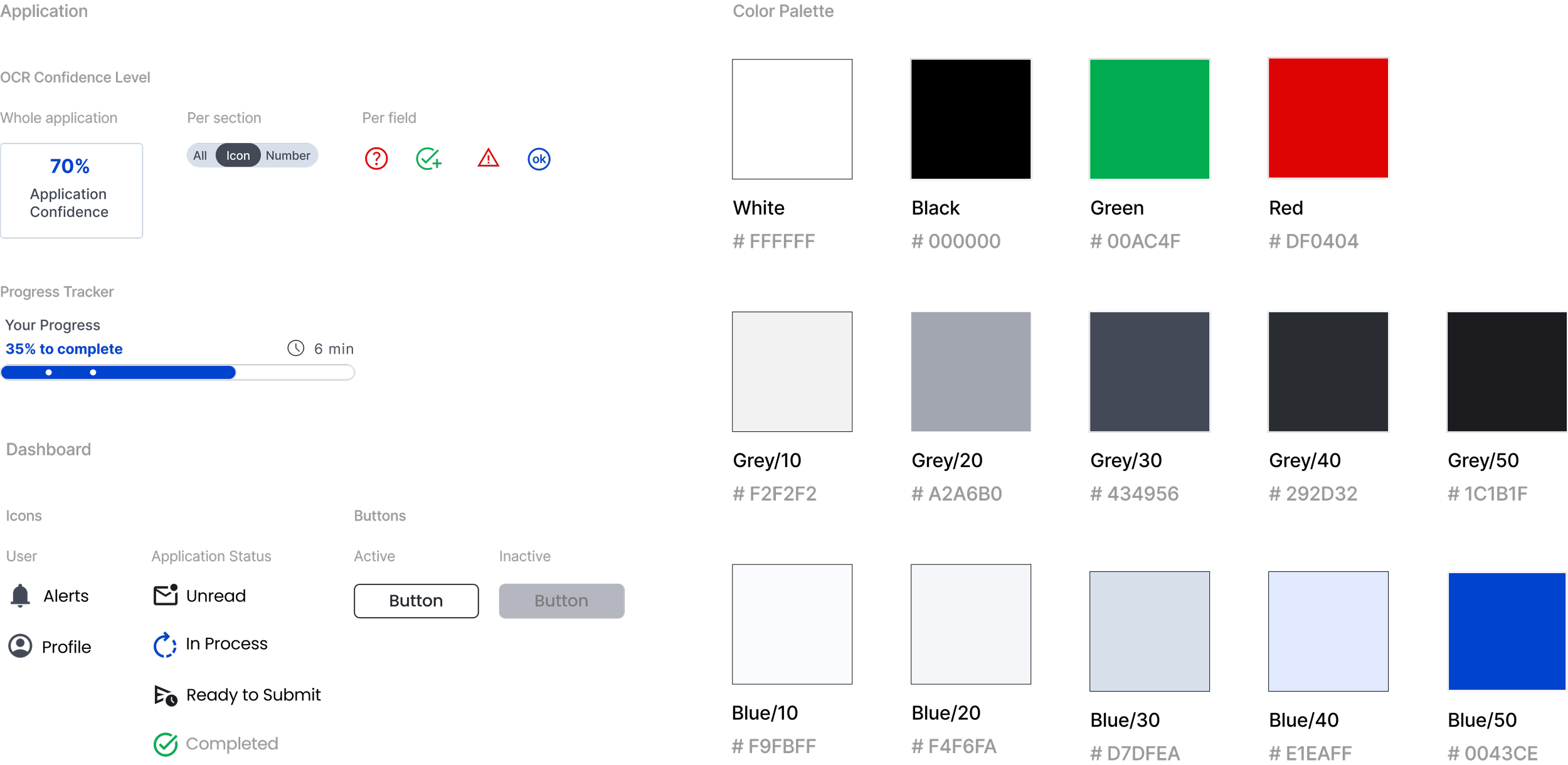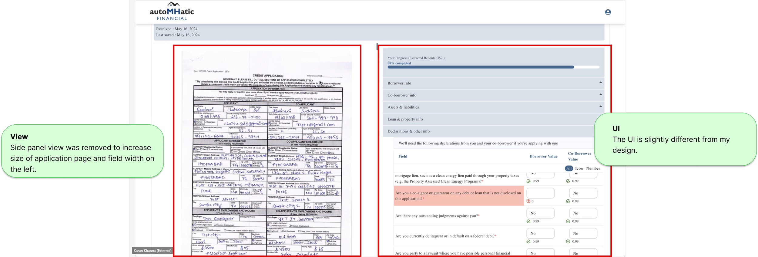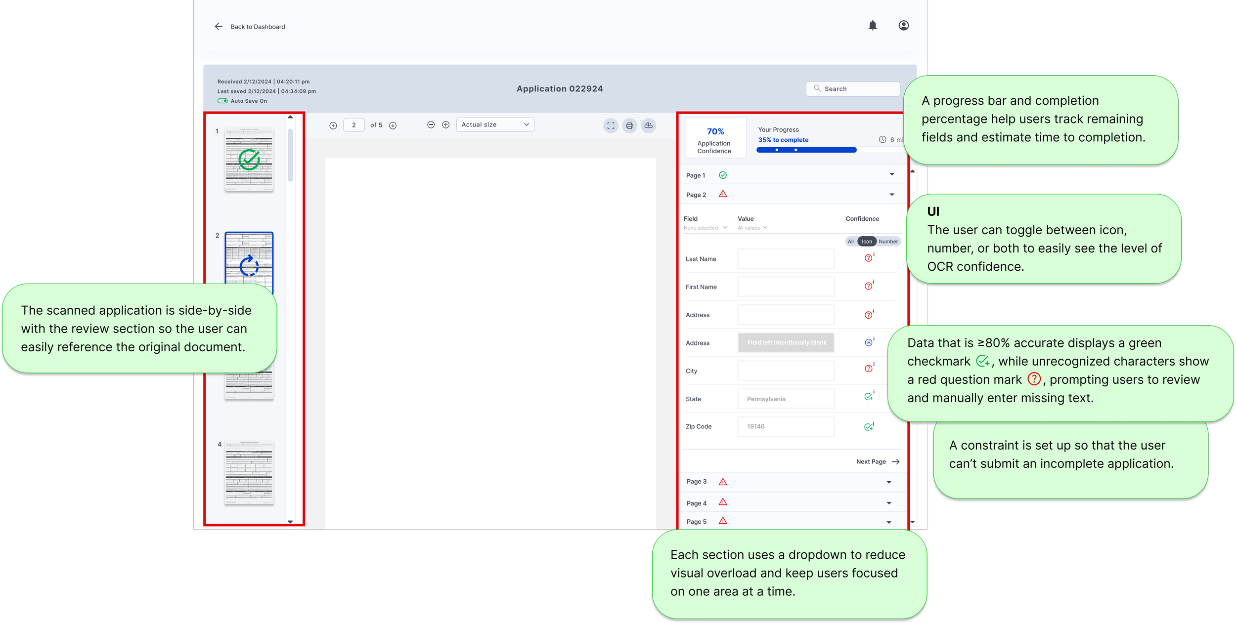 The project manager and I mapped out the field types and OCR behavior, which informed a structure of collapsible sections that let users review the application step-by-step. Icons indicate required review, OCR confidence, and intentionally blank fields. I also added a progress bar showing estimated review time and overall OCR confidence to help users manage their workflow.