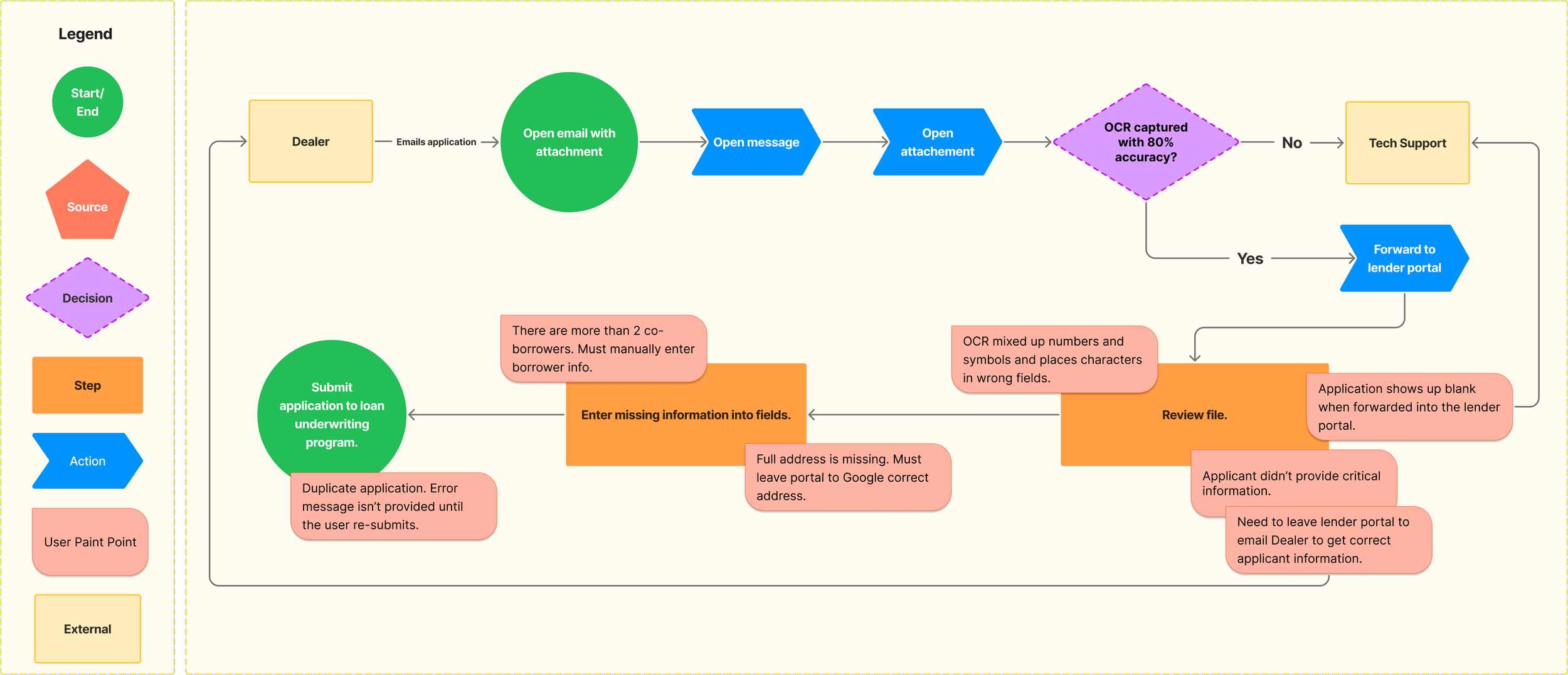 The commonality among the users’ pain points was that they all delayed the application for being processed, thus prolonging the application processing time. When devising the storyboard I returned to the business’s goal of timely application processing and considered how all these hold ups would make the user feel.