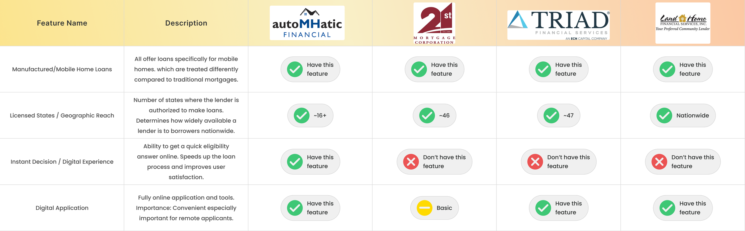 I reviewed three manufactured-home lenders and learned that the MH market operates very differently from traditional mortgages: it carries higher risk, requires a more rigorous application process, and often results in higher rates and fees. Lenders with MH expertise are especially valuable because buyers must navigate a unique, outdated purchase process where dealers still rely on paper applications that are manually entered or emailed to loan officers. This makes aLLoan’s product for AutoMHatic particularly significant, as they are the only MH lender offering a digital application with instant decisioning.