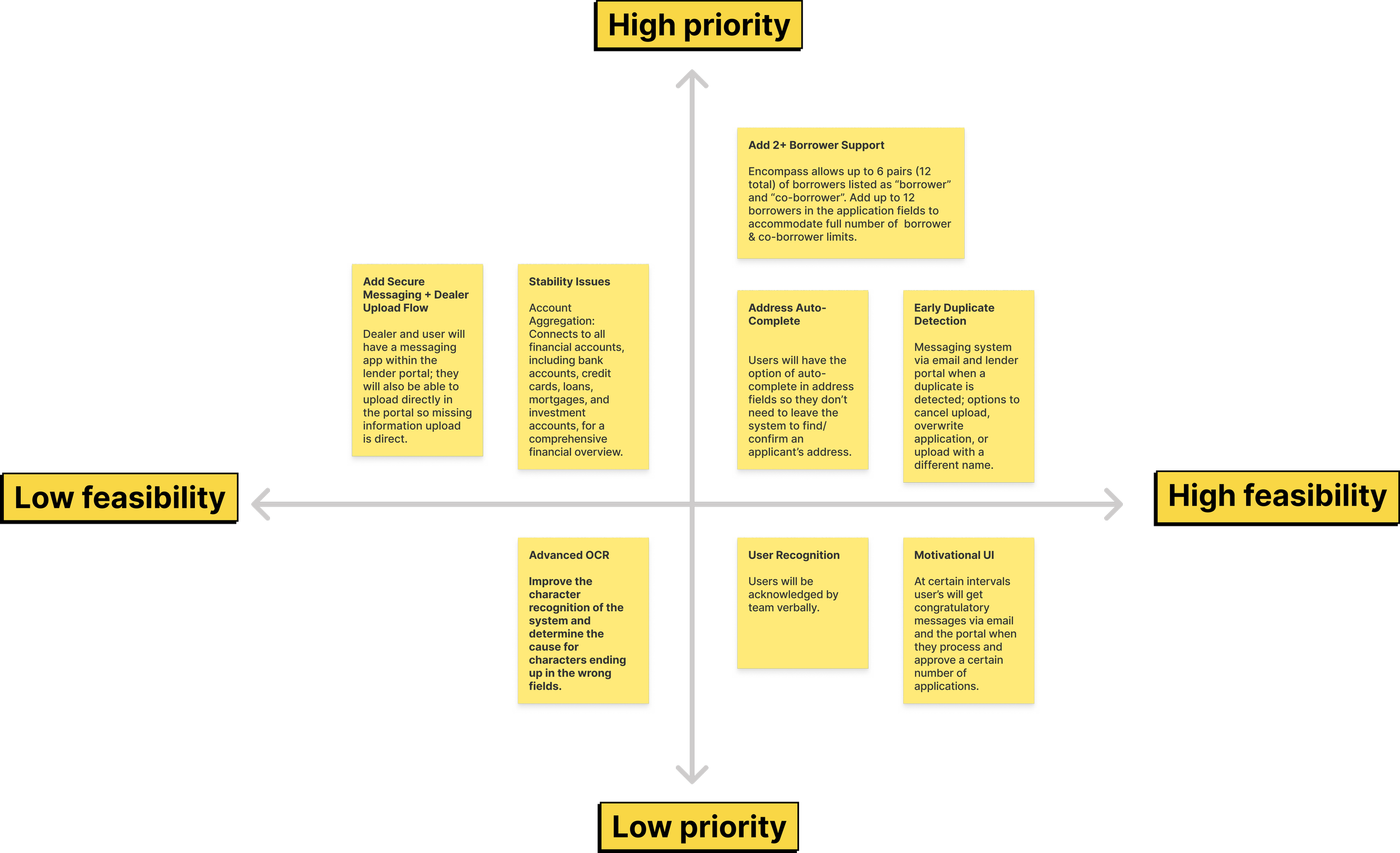 In the next phase, I would focus on the prioritized solutions listed below to address the users’ pain points. They’re organized by level of urgency and difficulty to determine which would have the most impact.