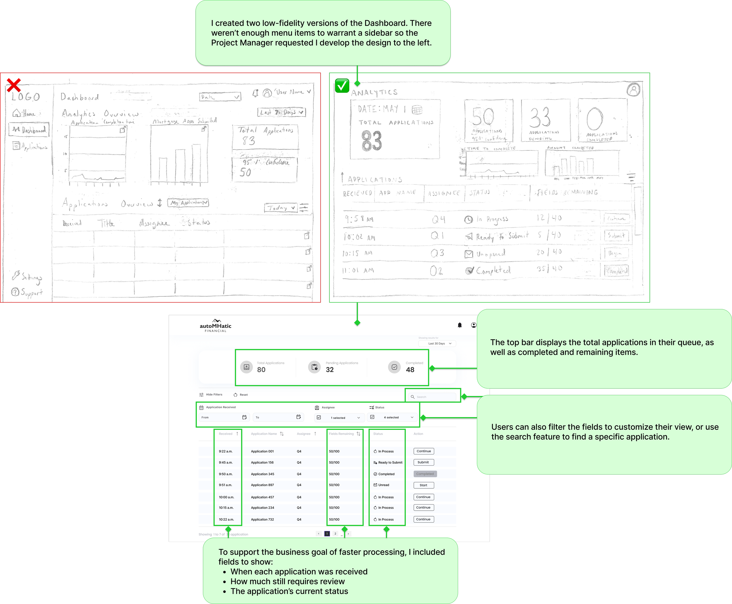 As UI/UX Designer & Researcher, I led the design of two high-fidelity wireframes for AutoMHatic’s MVP, translating complex operational needs into a streamlined user experience ready for developer handoff. AutoMHatic, a manufactured home lender, uses AI to scan applications and extract data, but verification gaps introduced friction and delays. The challenge was to design a system that allowed users to quickly complete missing information and streamline processing time.